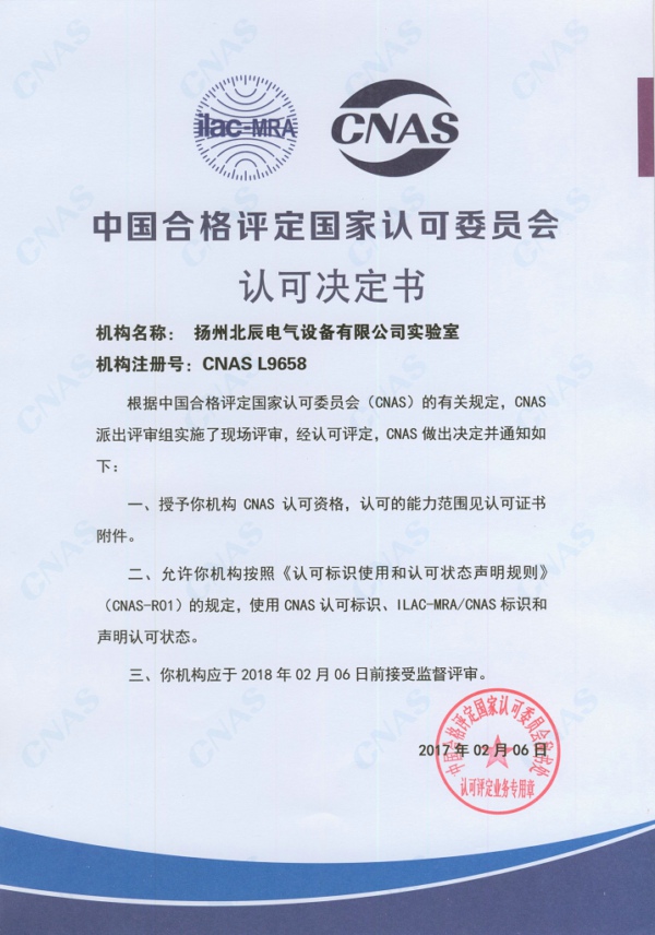 2017年2月6日,揚州北辰電氣設備有限公司實驗室獲得了中國合格評定國家認可委員會(CNAS)頒發(fā)的實驗室認可證書。