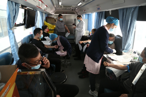 上午八點(diǎn)半,臨時(shí)體檢臺(tái)前等待獻(xiàn)血的員工們?cè)缫炎杂X排起隊(duì),填表、體檢、上車獻(xiàn)血,一切正有條不紊地進(jìn)行,愛心獻(xiàn)血車內(nèi)座無虛席。