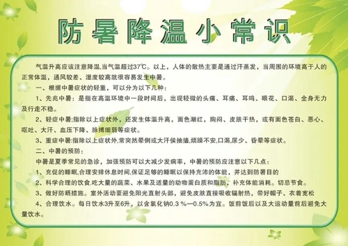 一是加強夏季防暑教育。入夏后,公司特邀揚州市安全生產(chǎn)學(xué)會秘書長朱建中針對夏季防火、用電、防暑應(yīng)急救護(hù)等知識開展專題安全培訓(xùn),向員工講解防暑降溫的措施和用電等相關(guān)安全知識,教育員工做好自我安全保護(hù)。公司還在廠區(qū)內(nèi)關(guān)鍵醒目位置還設(shè)置防暑降溫知識宣傳展板,并通過微信公眾號推送等形式,做好夏季高溫注意事項溫馨提示。