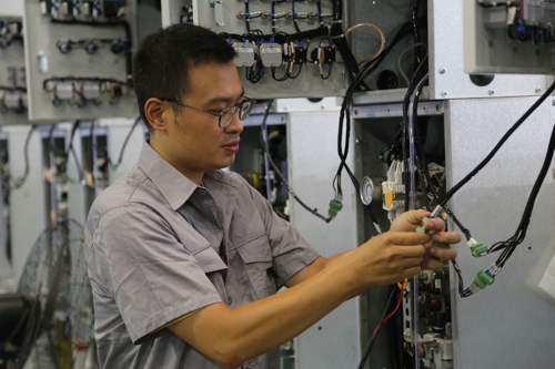 圖為自動化部員工在車間蒸騰的氣息里,完成無錫游圣變一體化電源裝配工作,這是他們的一份責(zé)任、一份堅守、一份擔(dān)當(dāng)。